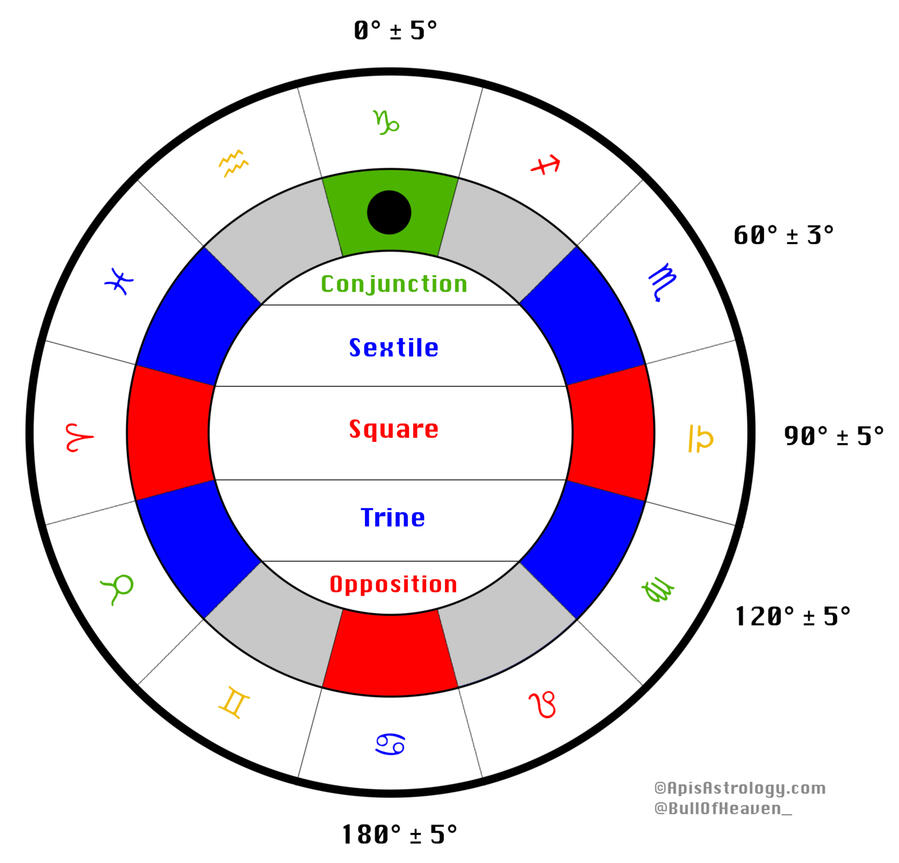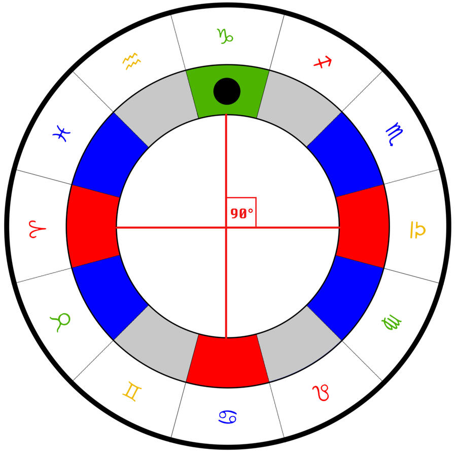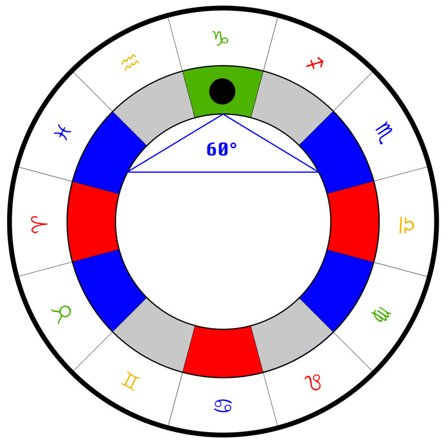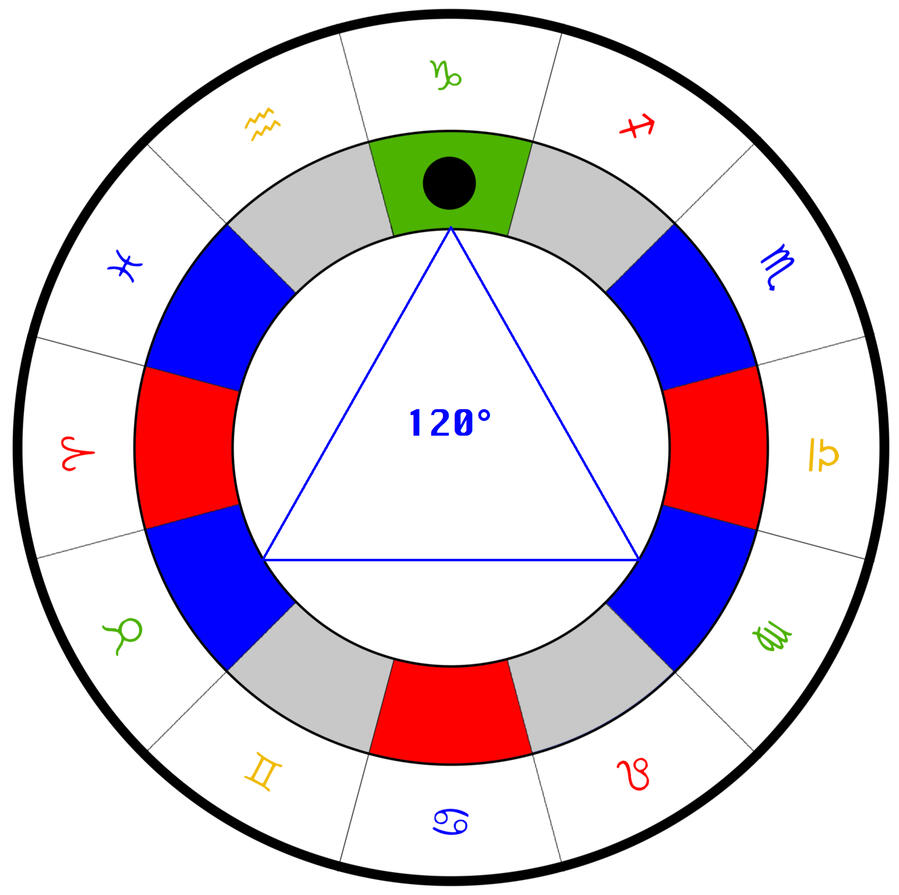 When planets in your chart make certain angles to each other, their energies are combined. This is called an "Aspect". A planet in Capricorn (black dot) can make aspects to any of the Signs with red or blue highlights - but what does this do?