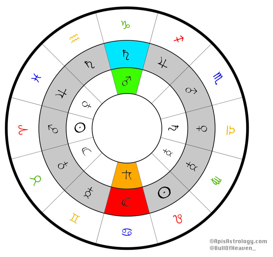 A planet in its Throne is stronger than anywhere else in the chart. It is the soul of the Sign in question and can shine through undiminished. Saturn is Enthroned in Capricorn, where its capacity for self-control, discipline and sacrifice is given every chance to express itself.Those on the inner ring just below them (Green) are Exalted.